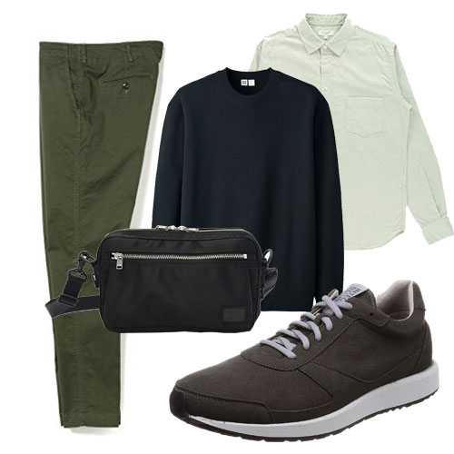 では具体的なコーディネートをご紹介していきます。1つ目はこの商品に一番マッチする直球の「キレイ目」コーディネート。スニーカーとショルダーバッグで少しだけアクティブな雰囲気にしています。できるだけ使う色数を少なくしたほうが洗練された印象になります。